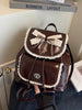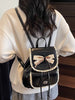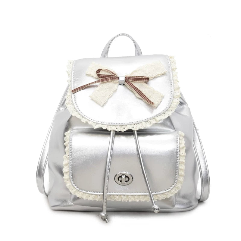This silver backpack for women features a bow accent and a compact design suitable for daily use. The backpack includes adjustable shoulder straps and multiple compartments for organizing essentials such as a phone, wallet, and small personal items. Ideal for school, commuting, and everyday activities.